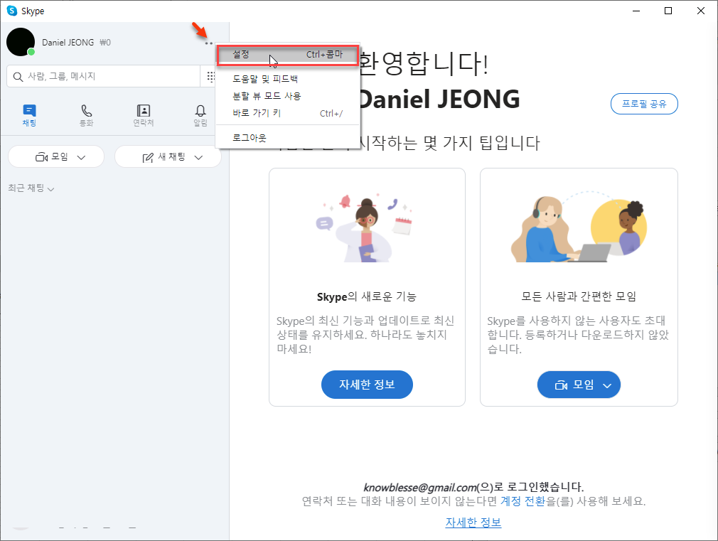 먼저 Skype를 실행한다. 언젠가부터 Microsoft가 Microsoft Teams랑 Skype를 쥐도 새도 모르게 깔아놓던데 아주 마음에 안든다. Skype가 깔려있지 않다면 찾아서 설치하자. 카메라 고급 옵션에 접근하는 다른 방법도 있을텐데 (video stream을 사용하는 다른 소프트웨어도 가능하지 않을까? OBS Studio 라던가) 이게 가장 간단하다.